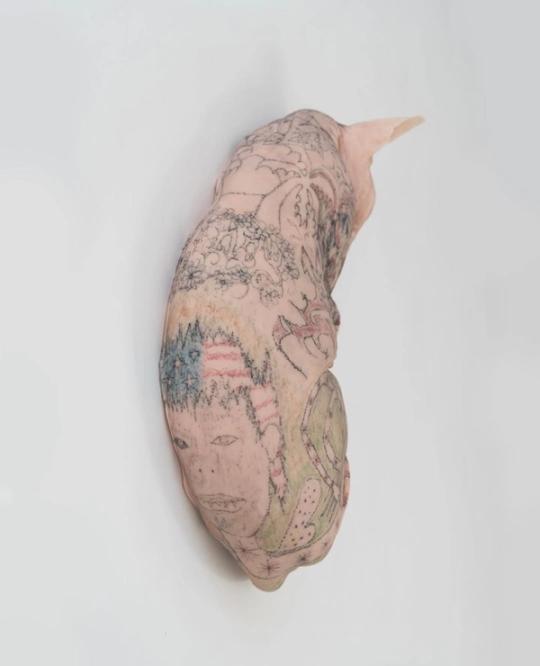 Leif Jones is a self-trained artist based in New York and working in a number of mediums. His work is both substantively and thematically expansive, but often juxtaposes a chaotic style with symbols of domesticity to unsettling effect. Such was the case in his Kush Kitten series created last year. For this triptych Leif created rubber models with a cast taken of a dead sphynx cat, which models were then tattooed in a scrawling print reminiscent of bad stick and poke and first tattoos given by friends. Last week, in collaboration with Leif, we released an exclusive candle modeled after these sculptural works.