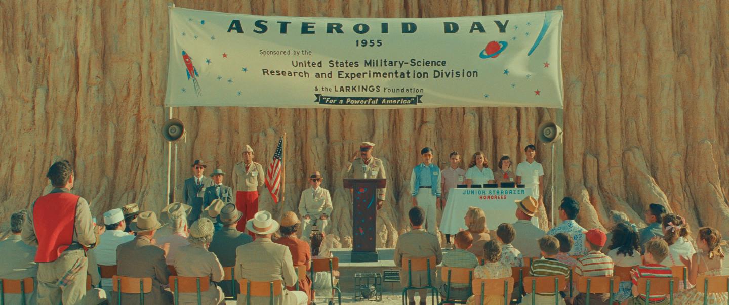 Changes to the design, presence, or manifestation of these brands can also imply crucial information about how the fictional world functions. Wes Anderson is deft at this technique. The wry hyper-literal titles of the various bureaus, buildings, organizations, and books in his films (example: Invisible Spectrum Elemental Surface Atomic Spectroscopy) alert viewers to the absurdist tone of his worlds. In Asteroid City, to take a different sort of instance, menus are magisculed on the front of cafés, a practical implication of the speed of passing vehicles. These changes to consumer product branding (and yes, the title of a book cover counts) are elegant delivery systems for worldbuilding.