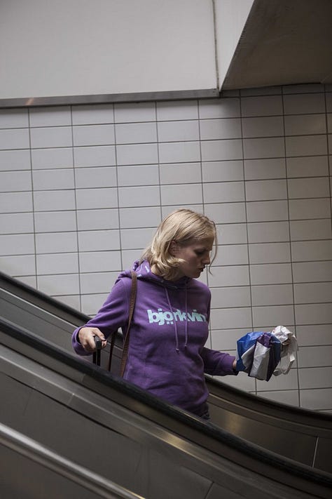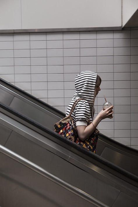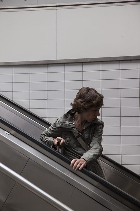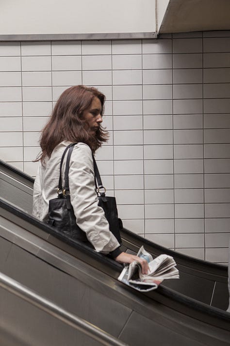 Between 2009 and 2010, Nigel Shafran photographed commuters descending escalators at London’s Paddington Station, documenting repeated moments of everyday travel from a fixed viewpoint.