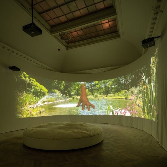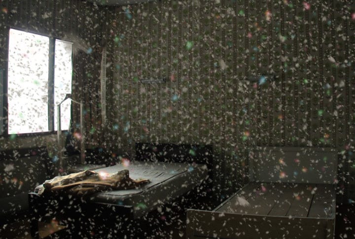 Apichatpong Weerasethakul - Morakot (Emerald), a single channel video installation filmed in the derelict building of a hotel. The film pans through deserted rooms of old stripped beds where the air is filled with slowly floating feathers which sparkle in the light.