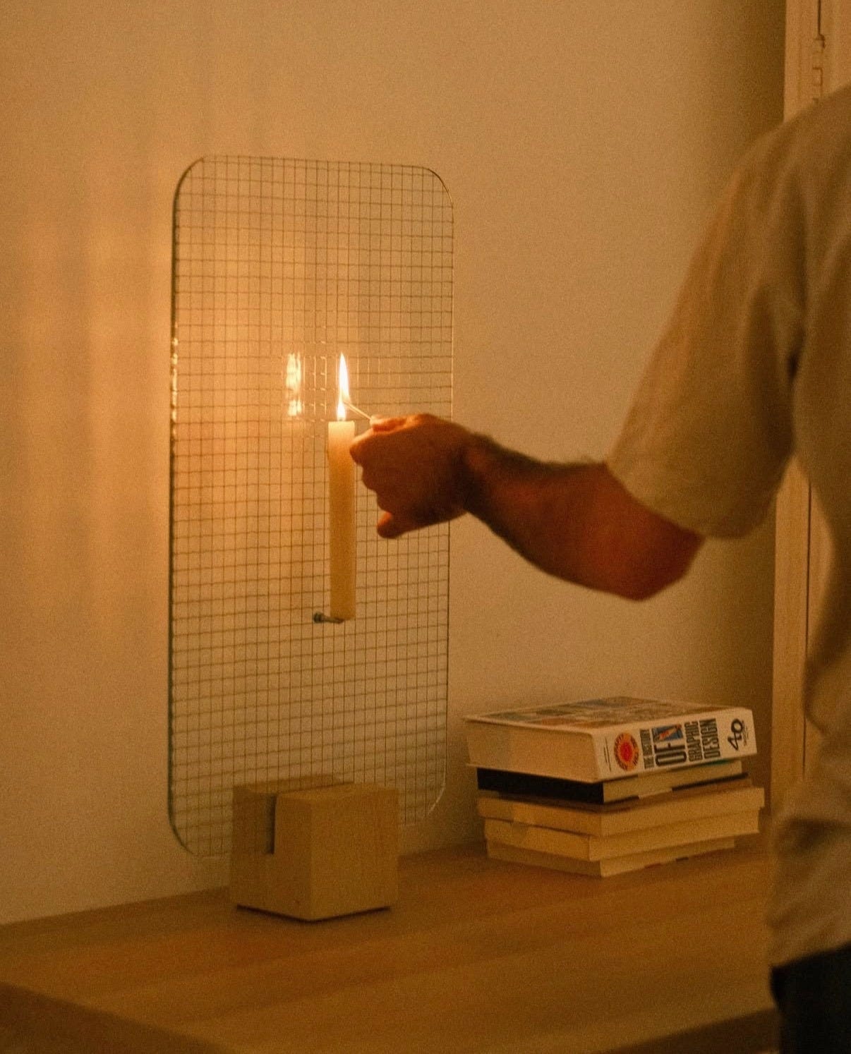 Handcrafted in Germany and interested in exploring elemental materiality, this lamp is composed of a sheet of wire glass, a hand-filed sandstone base, a stick candle, and a discreet metal pin.