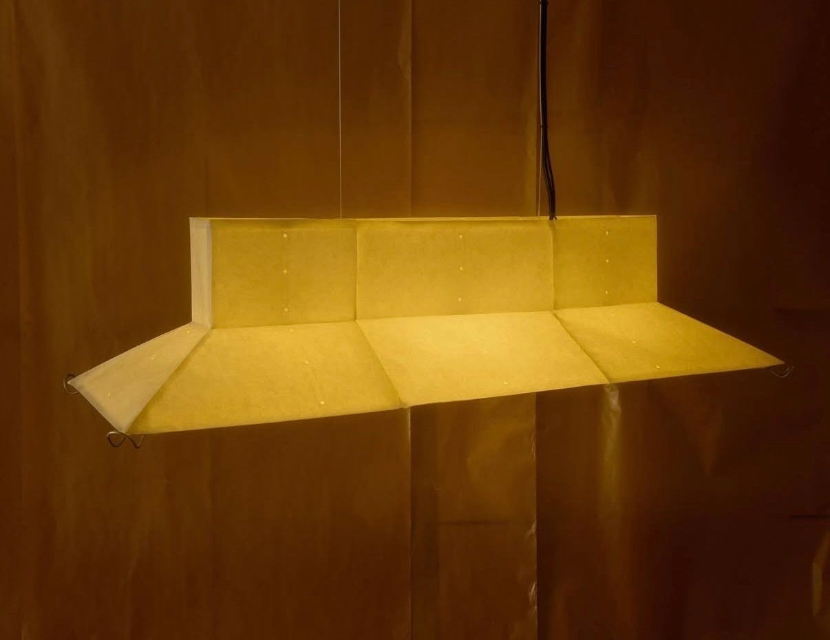 Following a process-driven approach through an ongoing series of sketches and hand drafts, Prezio’s lamp is crafted from paper, steel, and lighting components.