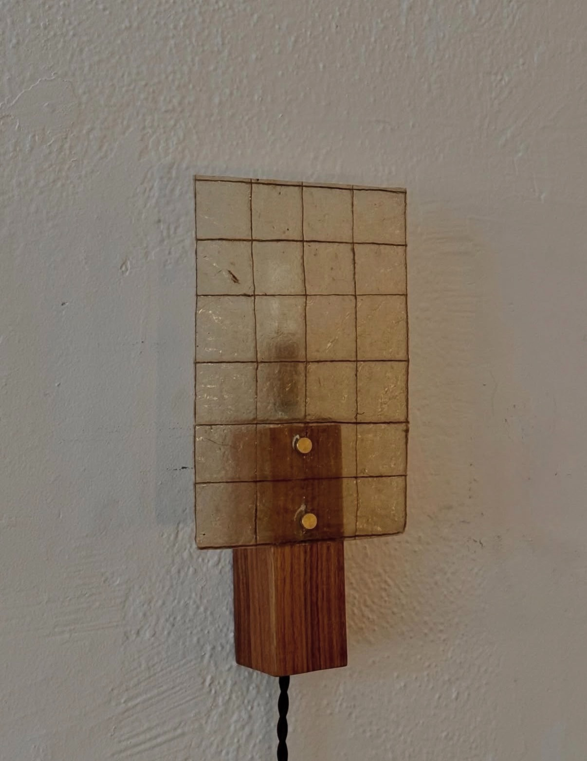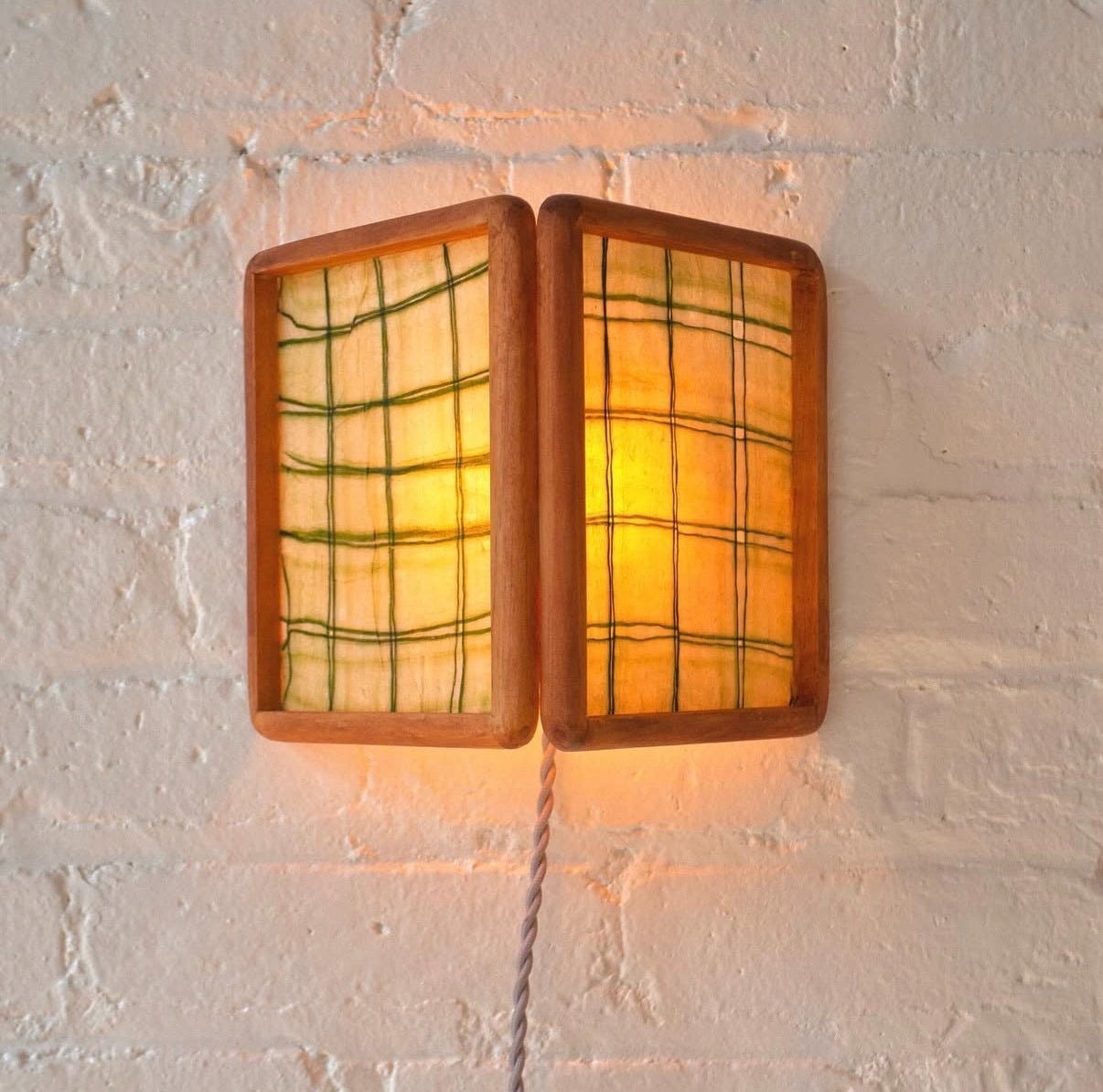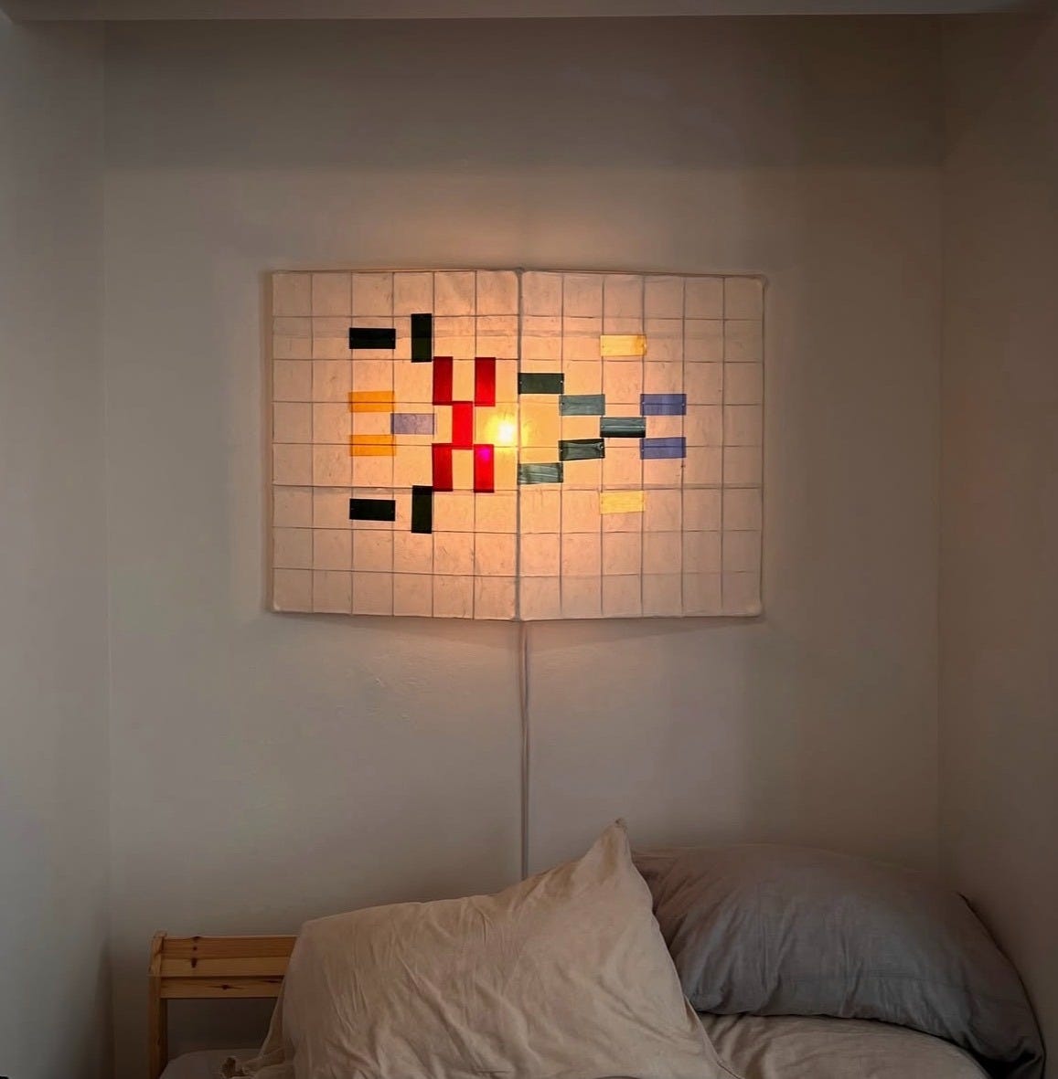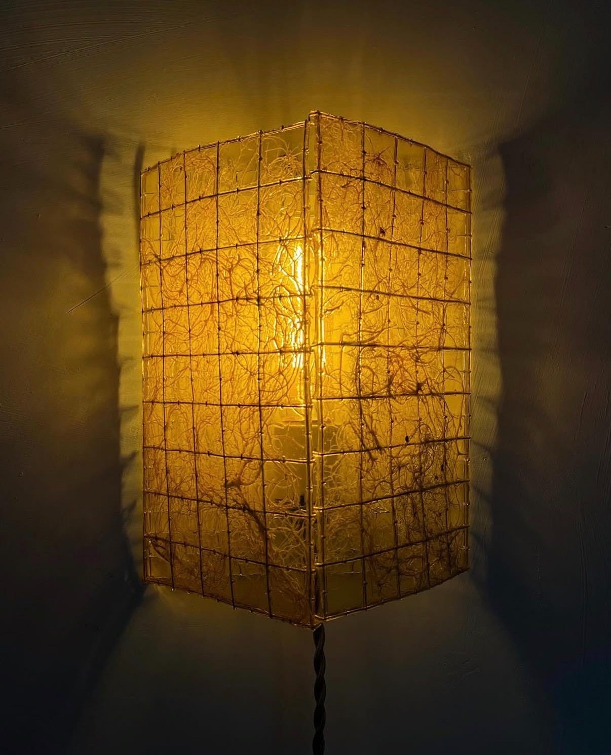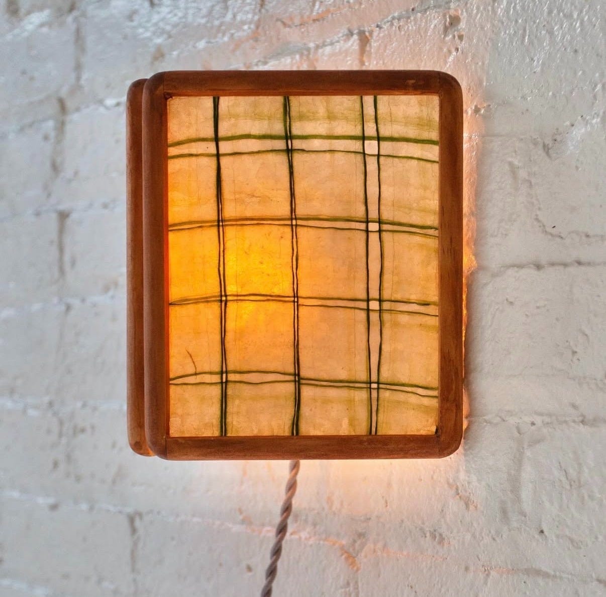 NYC multimedia artist Mark Séjourne’s tapestry style lamp is constructed from recycled wire grids, mulberry paper, hand-cut acrylic tiles, and magnets.