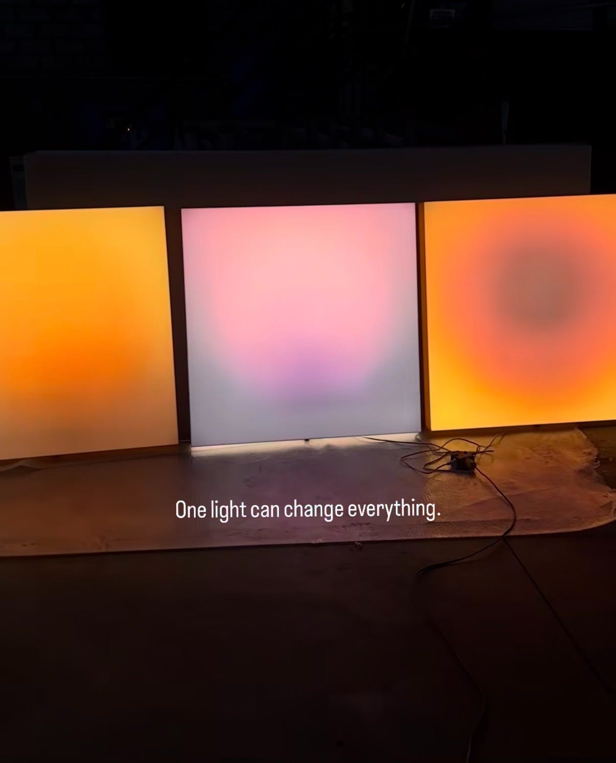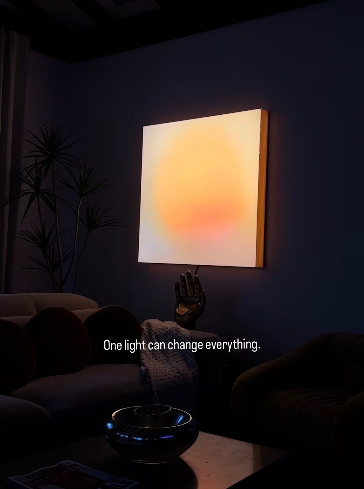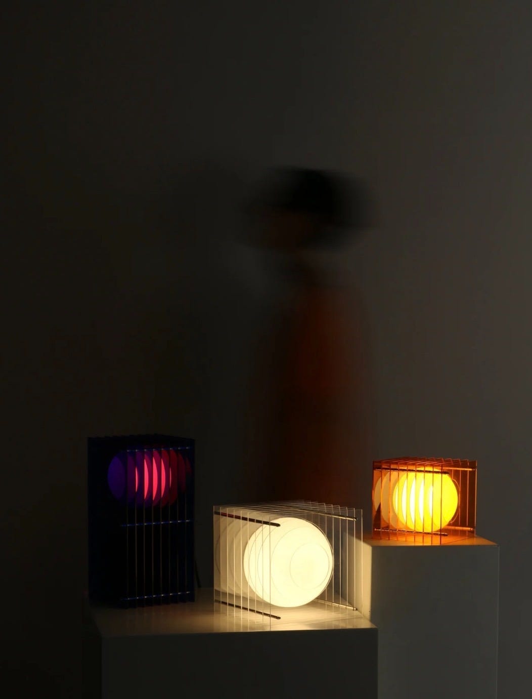 Reminiscent of James Turell’s light installations, the lamp is constructed of a mixed-media illuminated art panel, a gradient acrylic surface, and warm plug-in LED light.