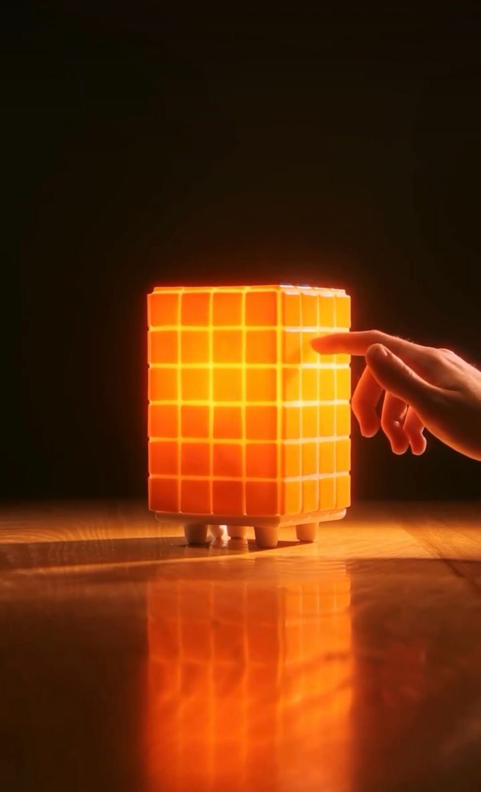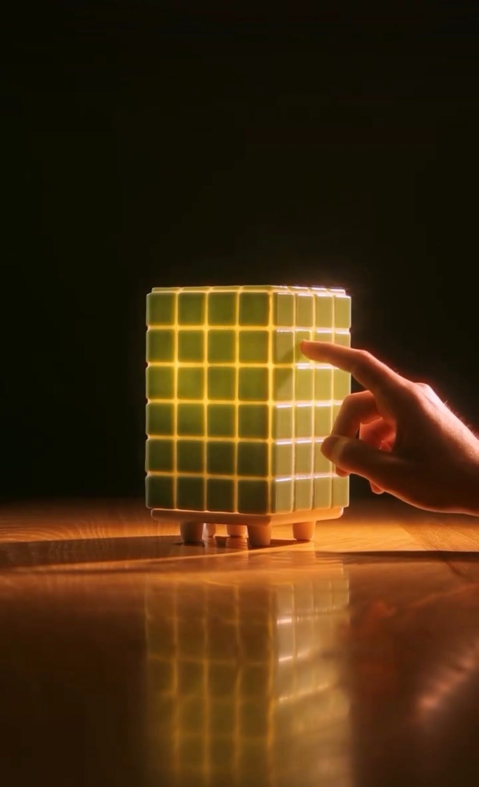 Features a hidden door in the back to insert the lightbulb, as well as a secret light switch embedded in the tiles. Made from recycled glass tile, PLA, and jesmonite.