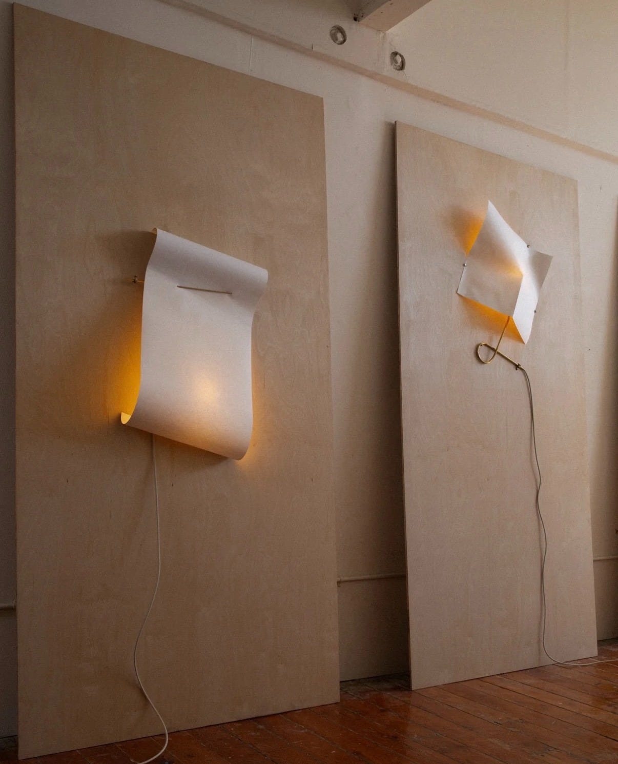 Handmade in San Francisco, these lamps feature sculpted shades resting on finely detailed brass hardware, transforming a flat, fragile medium into a luminous, three-dimensional form that emulates the materiality and appearance of paper.