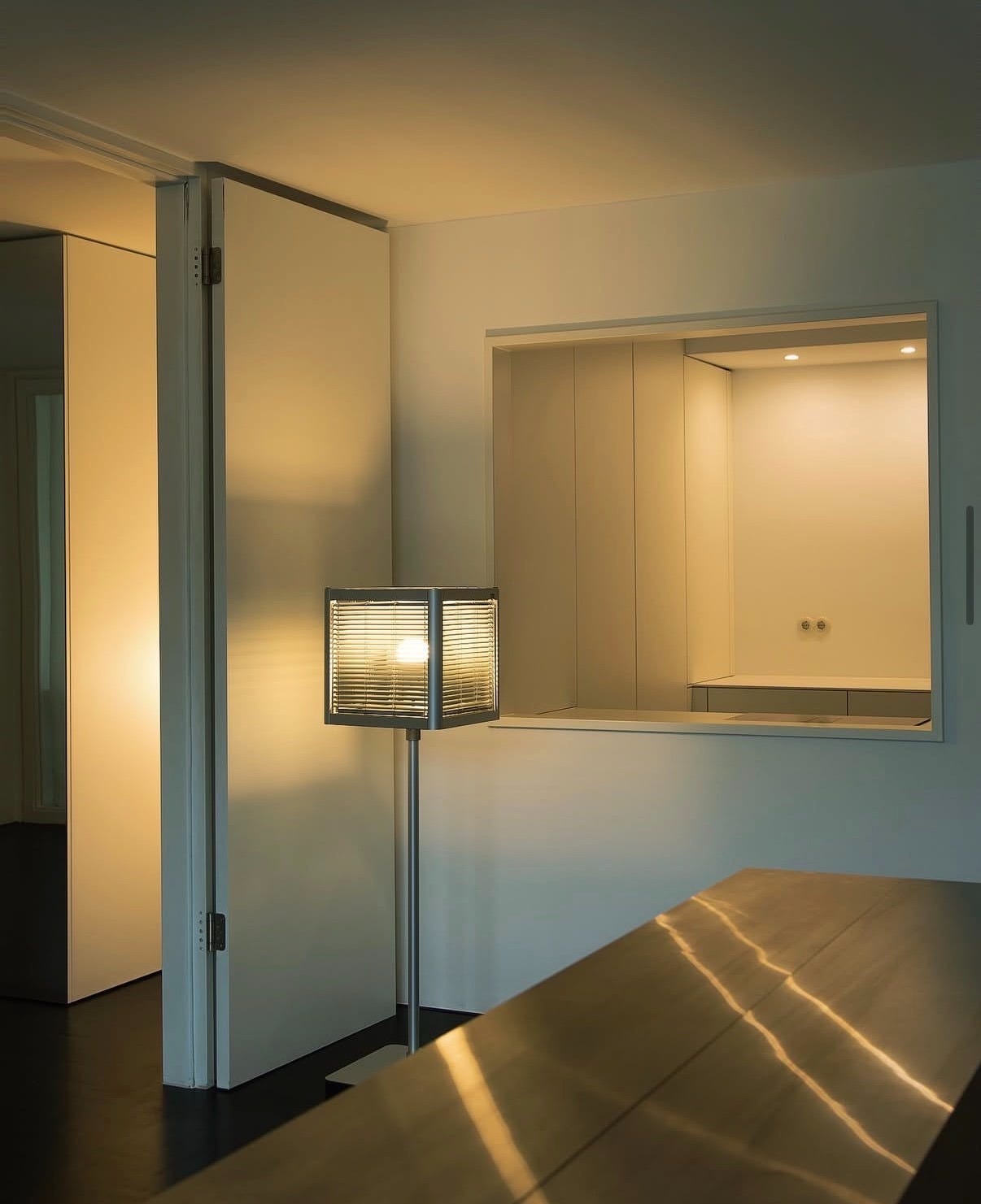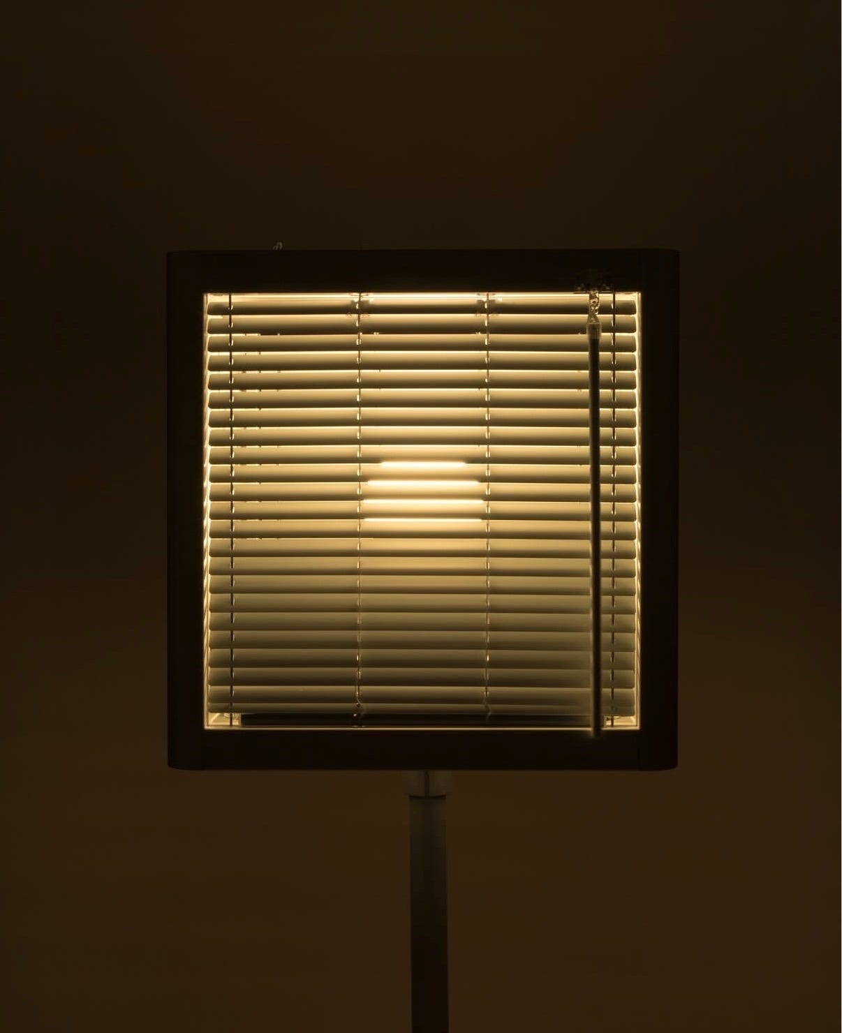 Referencing the sun peeking behind blinds, the lamp features 4 adjustable aluminum blinds in a simple aluminum cube frame. When moved, the light shifts like sunlight through clouds.