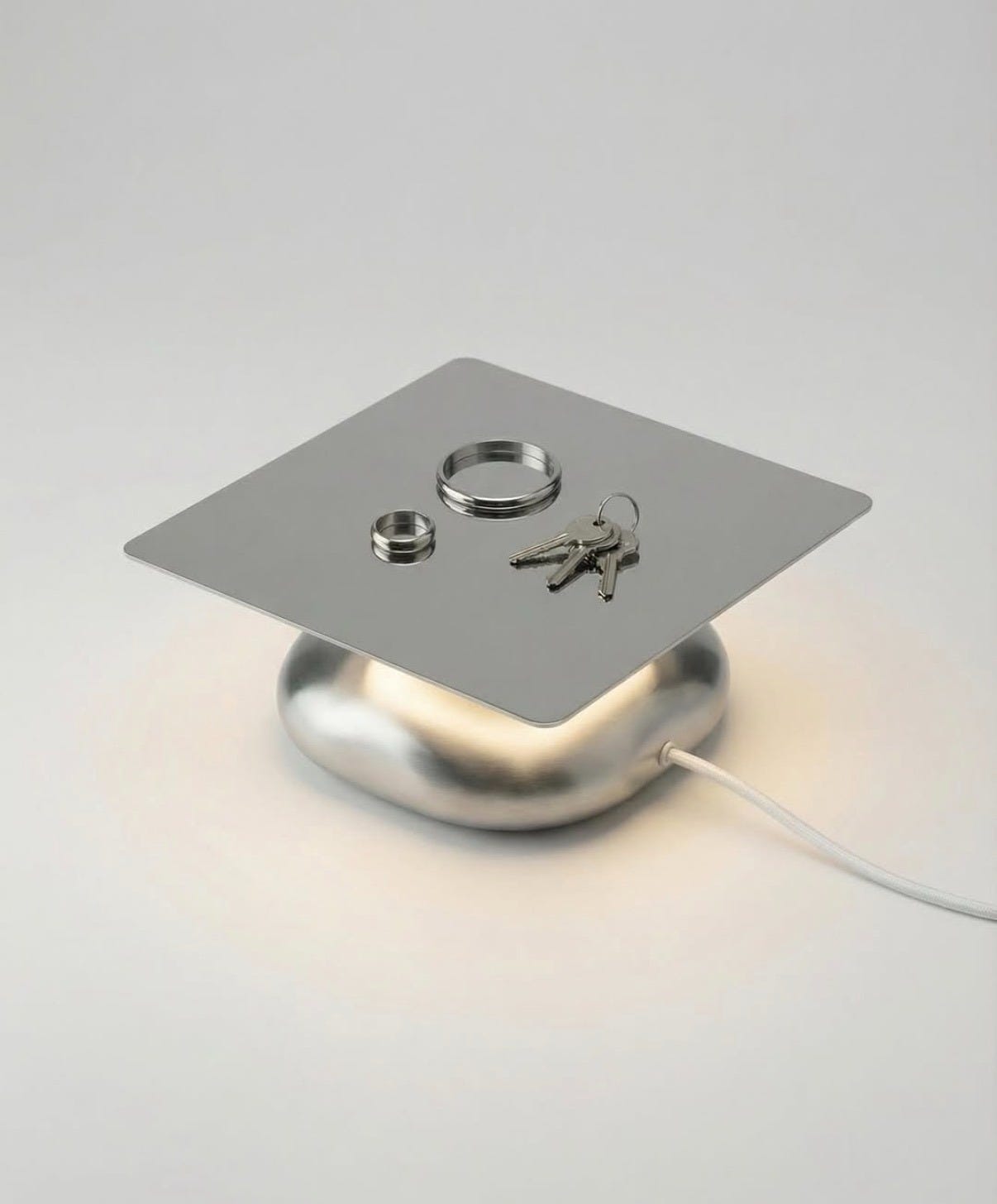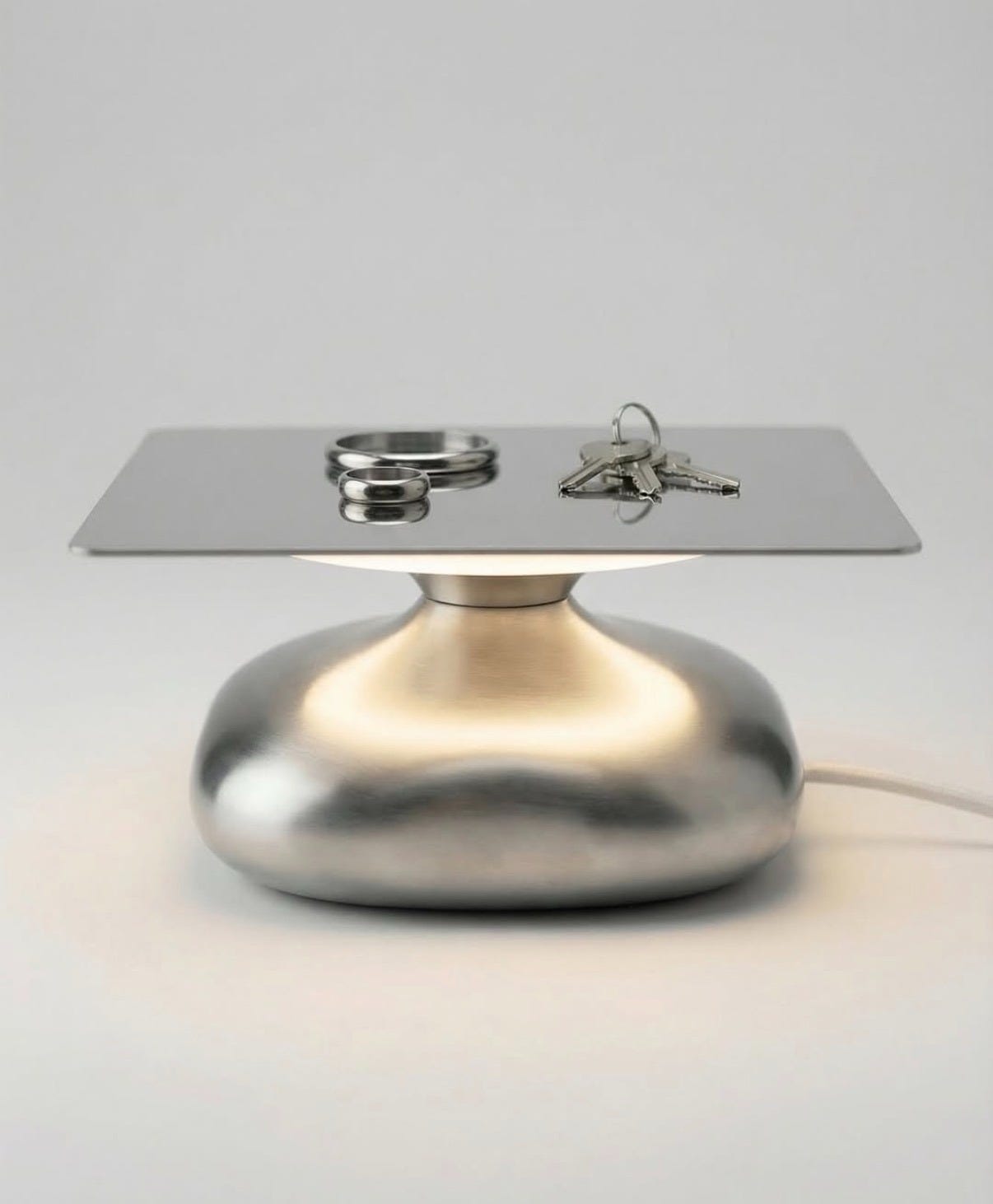 Made from brushed stainless steel and featuring a concealed light source, DUO functions as both lighting and storage for keys and jewelry.