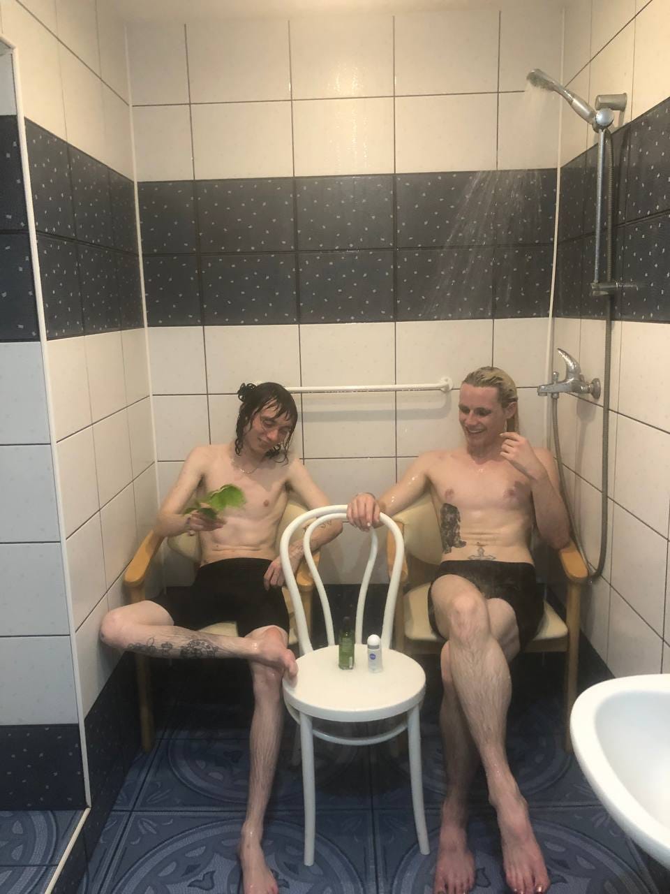 The hot tub had a sign that said ‘six people max,’ but like 20 people were constantly crammed into it. The morning of the second day the water was half drained and green. We were like, damn, that’s unfortunate, but then remembered they had these large floor-drain shower rooms. So I dragged 3 chairs there and sat under the shower with Angus & Tea for like 3 or so hours. Various friends came by our shower office.