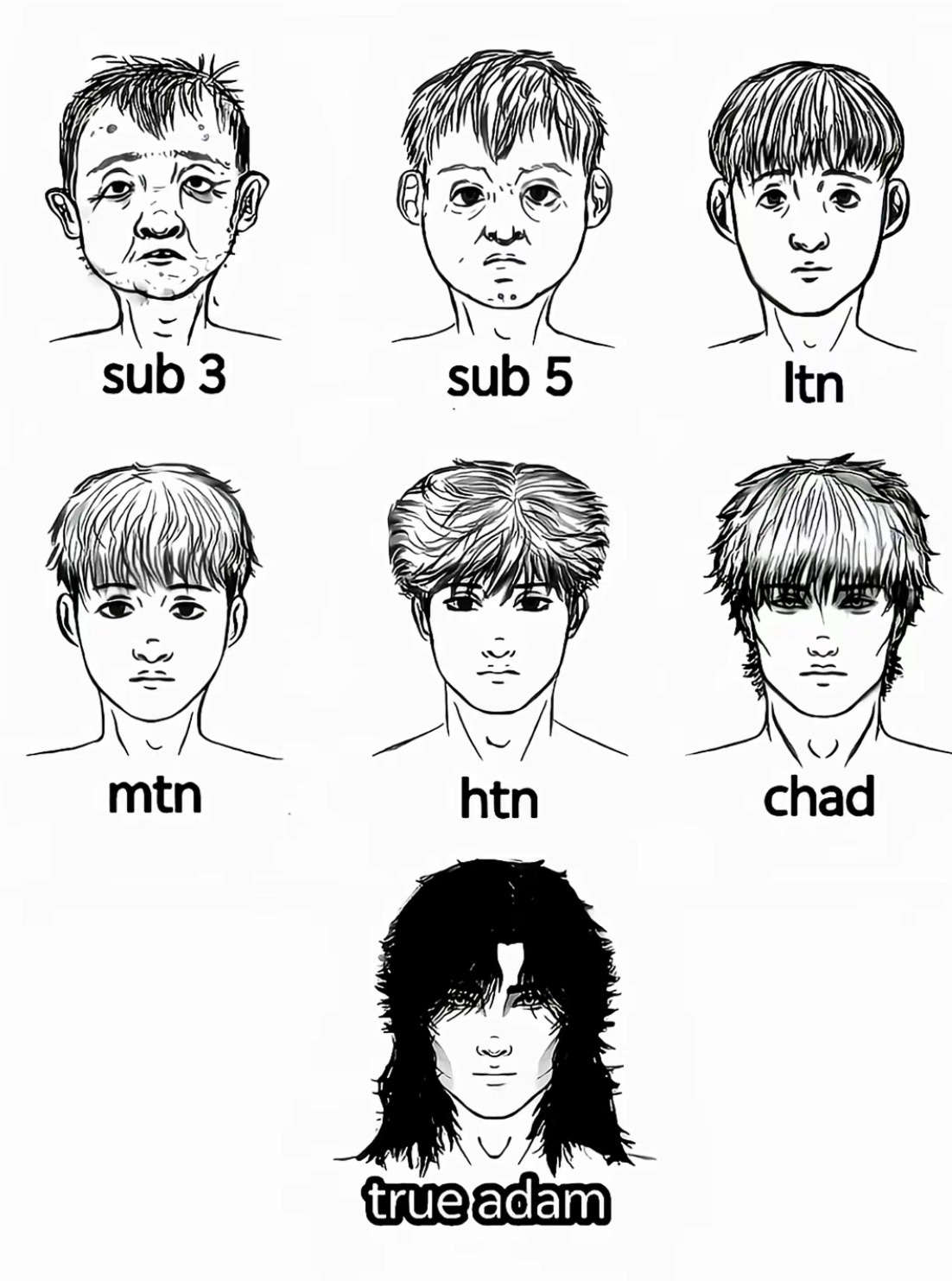 These tiers have assumed labels like low-tier normie, mid-tier normie, high-tier normie, Chad-lite, and Chad. The surrounding slang evolves constantly, with newer terms like “True Adam” and “True Eve”1 emerging recently. To make matters more confusing, as looksmaxxing has moved into general TikTok relevance, these agreed upon standards have shifted, leaving little consistency across different looksmaxxing subsets.
