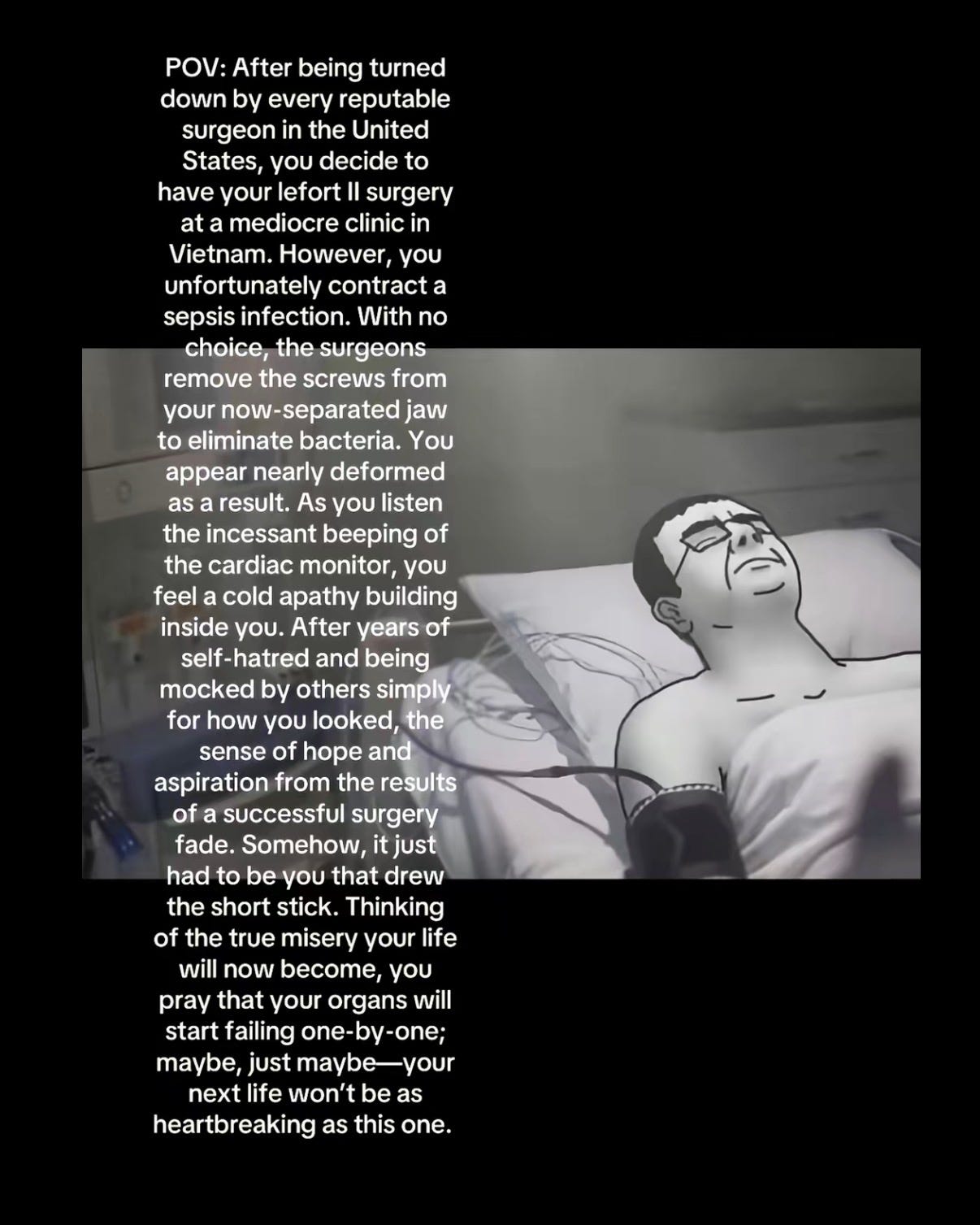 Now you know what it all means. Now you know vendors of unregulated Chinese research chemicals on Telegram. Your mom thinks your new mini fridge is for drinks, but really it’s to keep your peptides cool until it’s time to inject them into your stomach. You’re at the gym 5x a week. You’re intermittent fasting. Your bonesmashing routine is elaborate, consisting of 4x weekly 30-45 minute increments of hitting your face with varying degrees of intensity, targeting your chin, cheekbones, and mandible. When smashing your mandible, you have to bite down on a towel. You dye your eyebrows a darker shade. Your upper eyelid exposure in the mirror haunts you, so you cut your medial cantus—the inner corner of the eyelid—with household scissors to enhance eye sharpness.