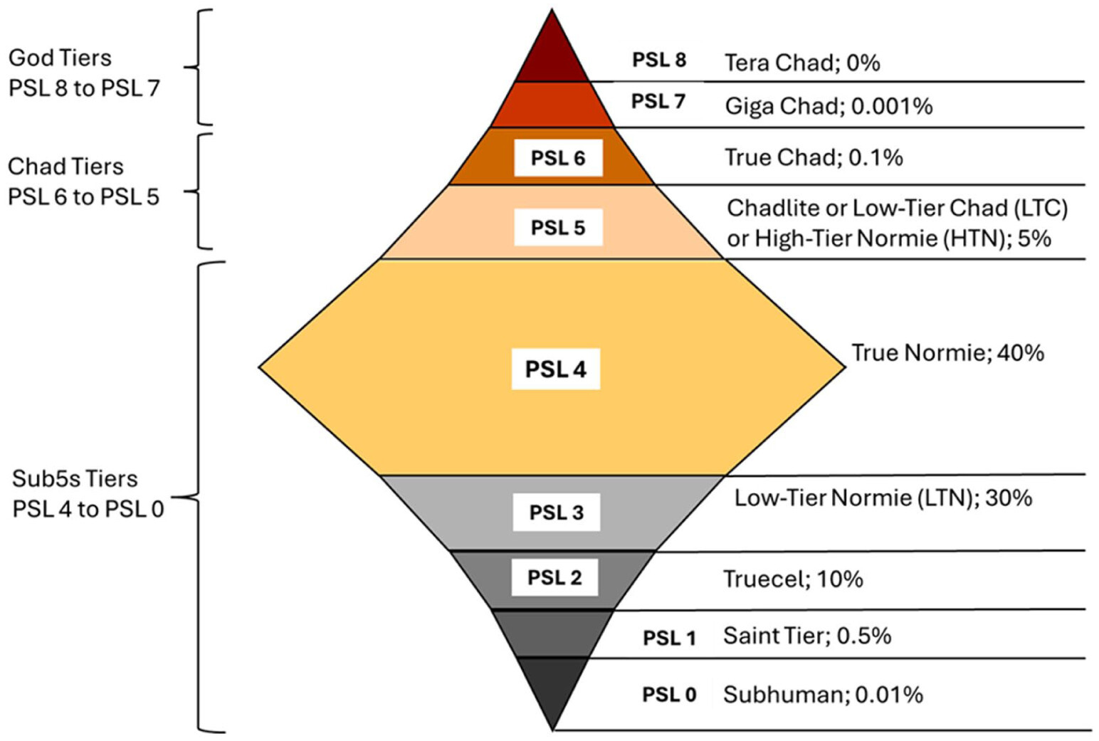 The PSL scale operates on a range of 1-8, divided into tiers based on attractiveness. The lowest tier (1-2) is “subhuman,” described as unanimously unattractive or disfigured. PSL 3 refers to noticeably below average faces with multiple perceived flaws. PSL 4 is average; PSL 5 is moderately attractive with no standout features; PSL 6 is very attractive; PSL 7 is extremely attractive and rare; PSL 8 is basically unattainable.