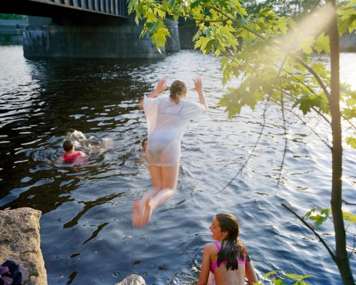 If water is a presence in these images, then so is heat. The summer swelter of Chicago, Maine, and Mexico provide the impetus for the subjects to make use of the water. Water is a salve for the oppression of temperature, a solution for inescapable weather.