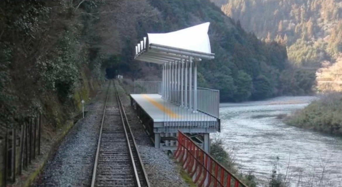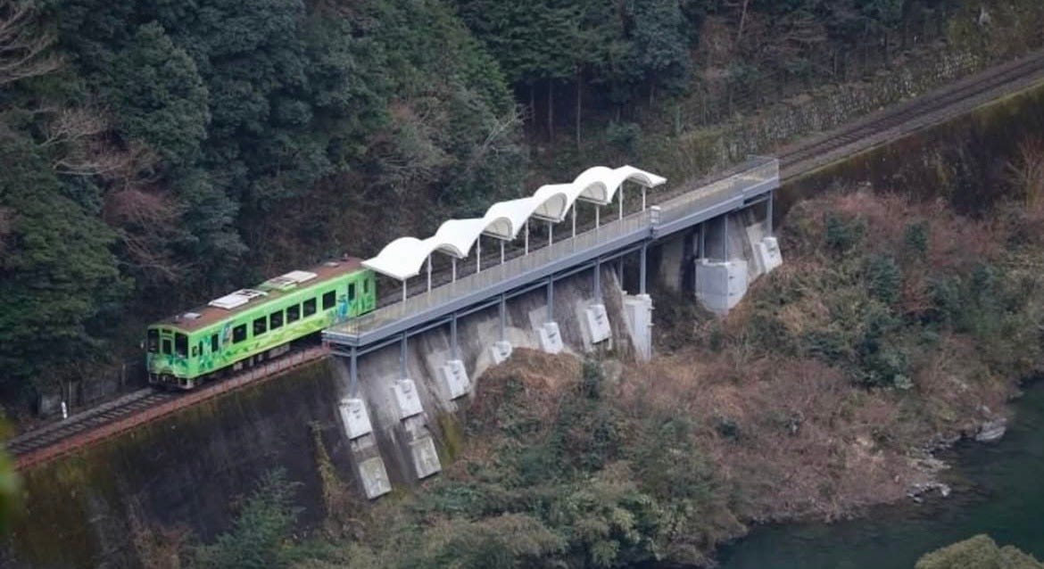 Located on the Nishikigawa Seiryu Line, the Station opened in 2019 as a sightseeing-only stop built directly over the Nishiki River. The station has no entrances, exits, roads, or surrounding buildings, and trains stop briefly so passengers can step onto the platform, take in the scenery, then board the same train to continue their journey.