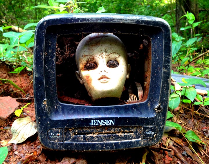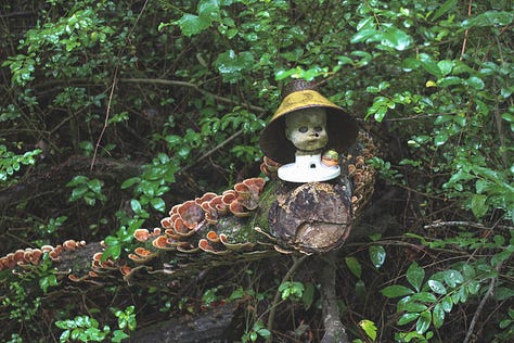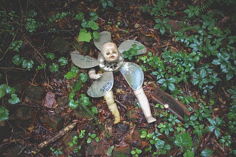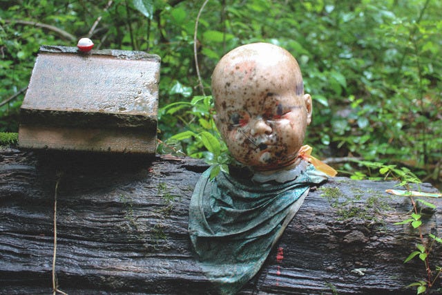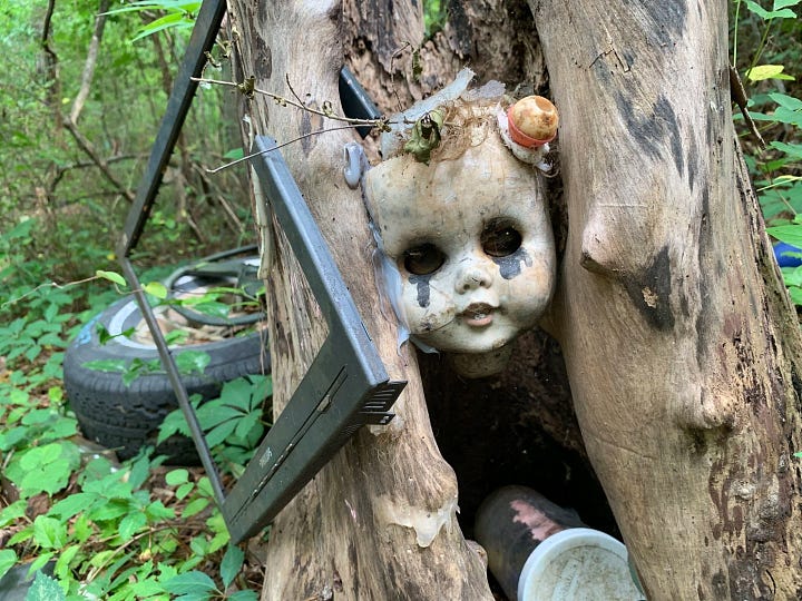 The Doll Heads Trail is a walking path inside Constitution Lakes Park where discarded doll heads and broken toys are arranged by visitors along the forest floor and trees.