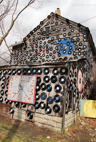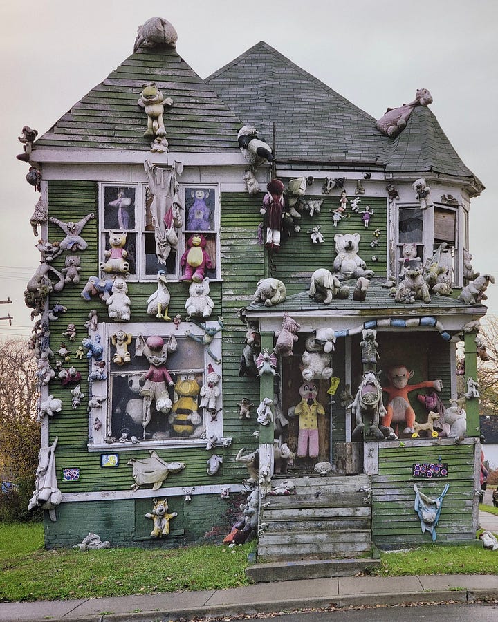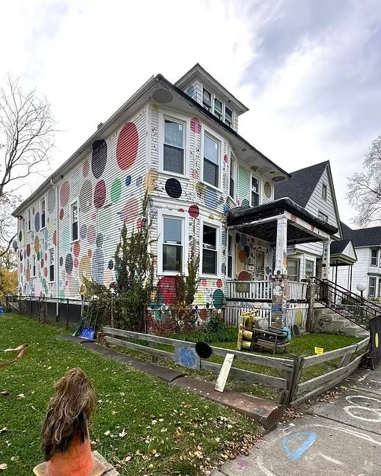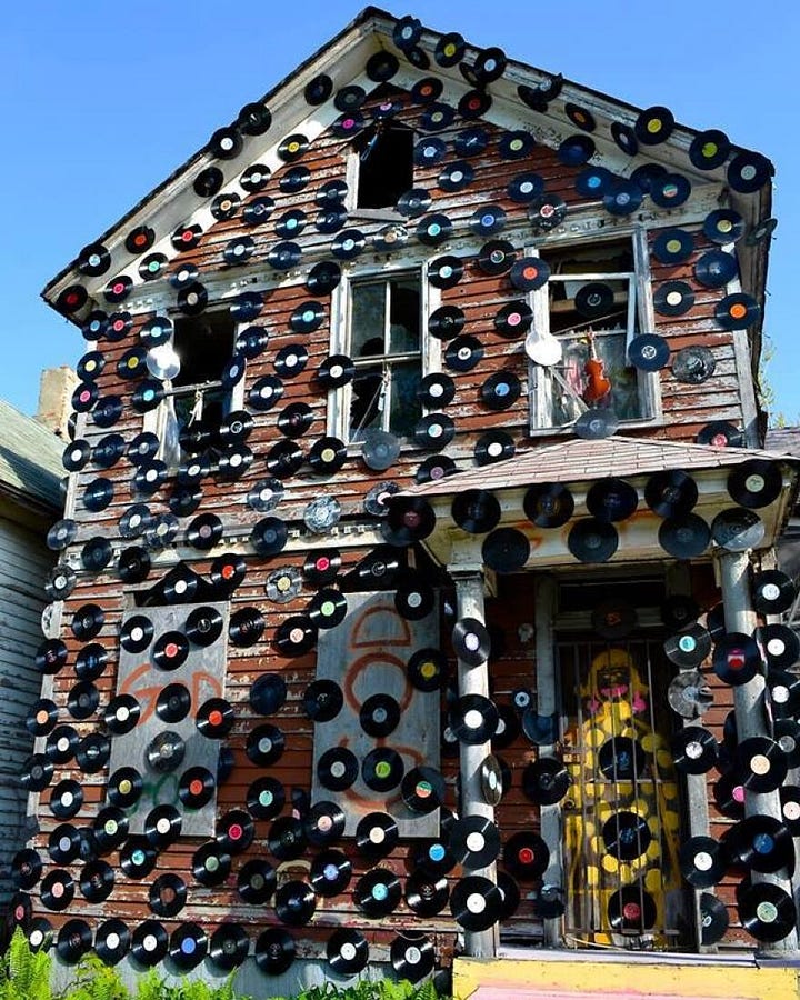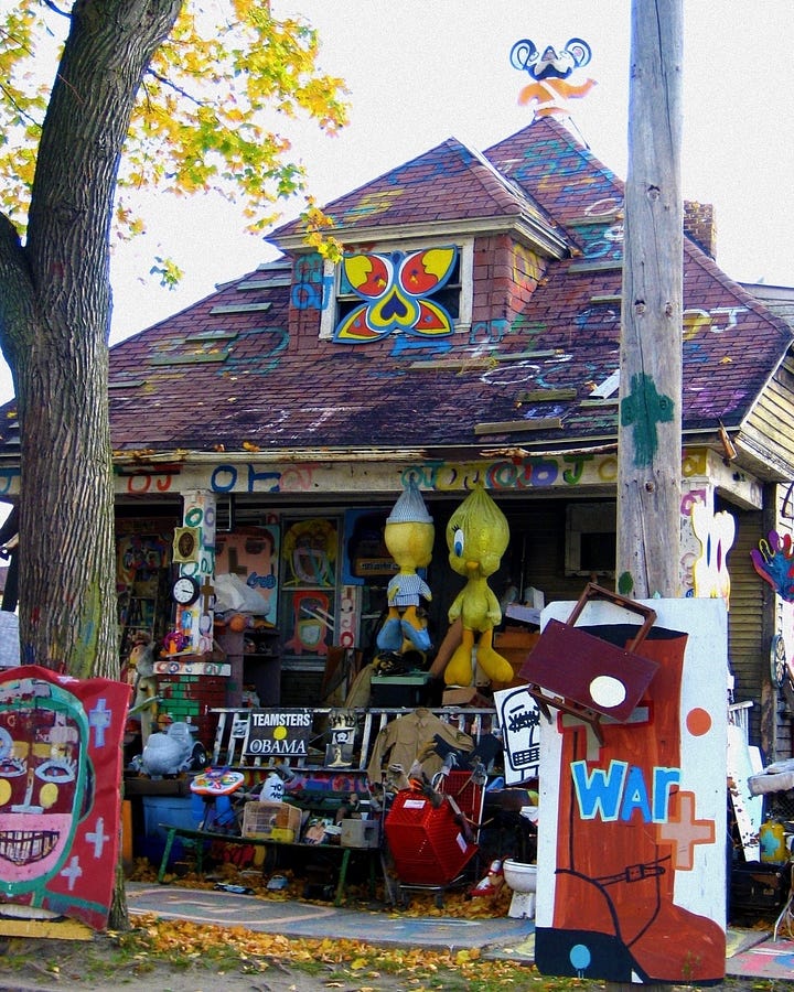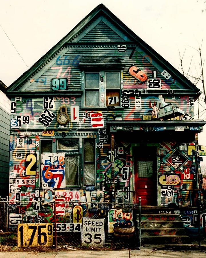 Working with his grandfather Sam Mackey and his wife Karen, he used toys, clocks, records and household items to mark abandoned structures and document conditions in the neighborhood. Individual houses developed themes, including facades covered in polka dots, damaged dolls or hand painted numbers.