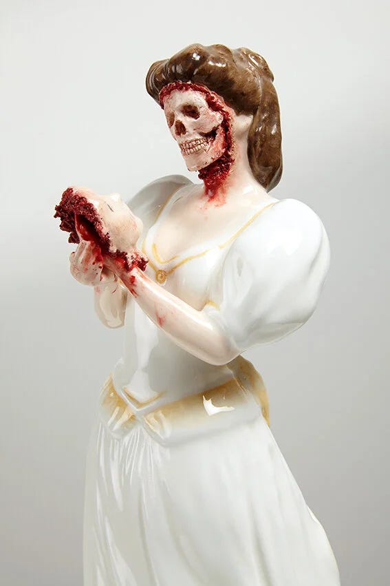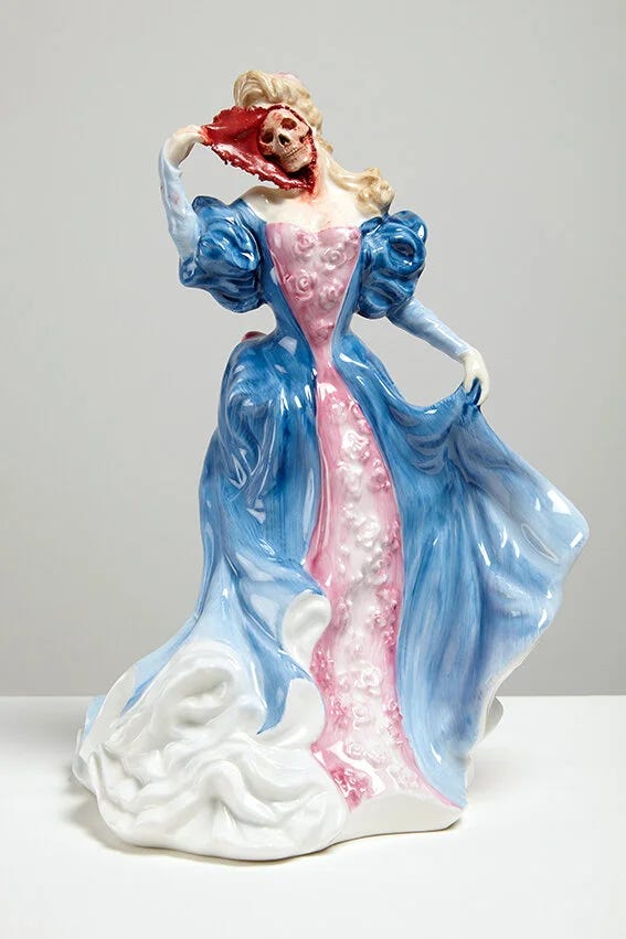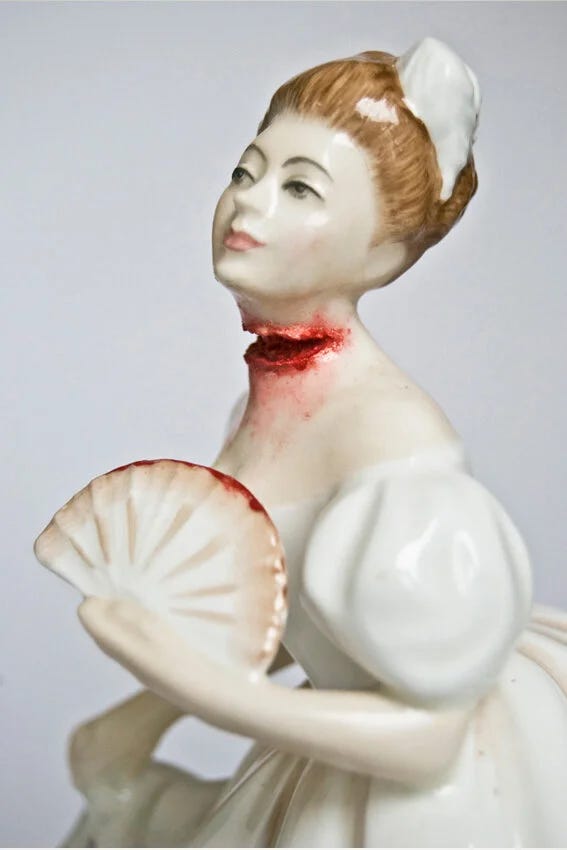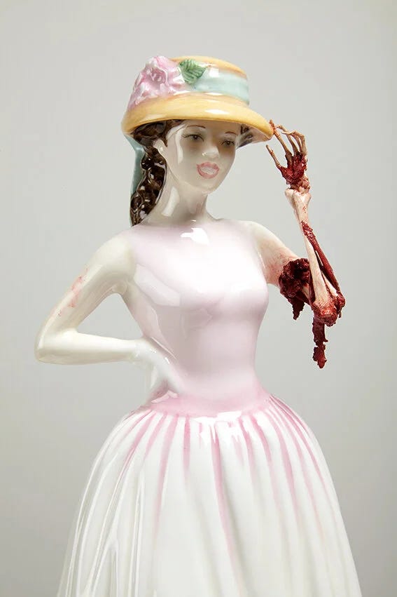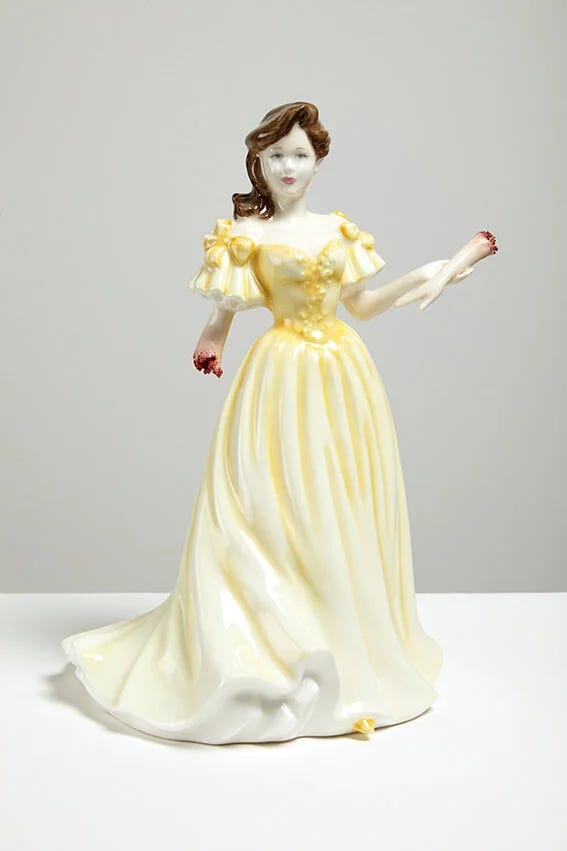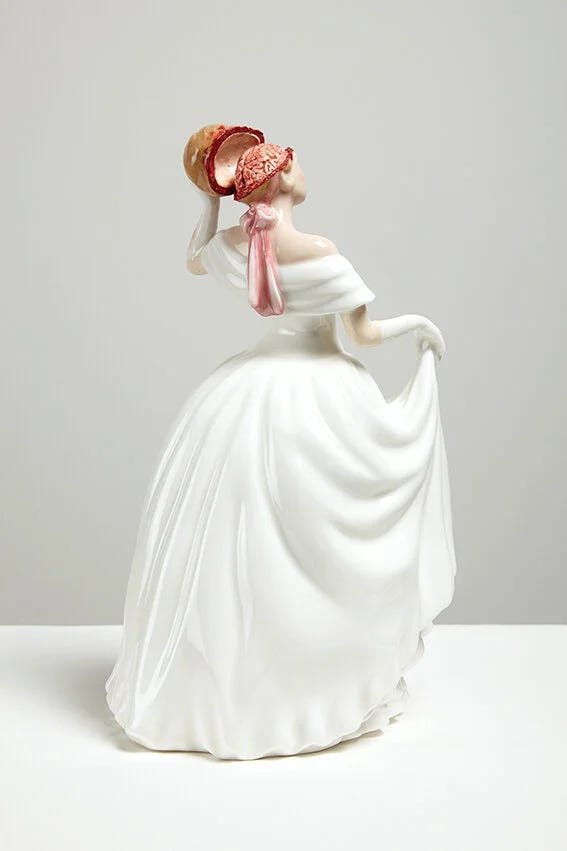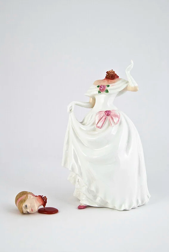 The works were created using second hand porcelain figurines sourced from charity shops and domestic collections.