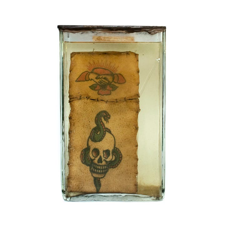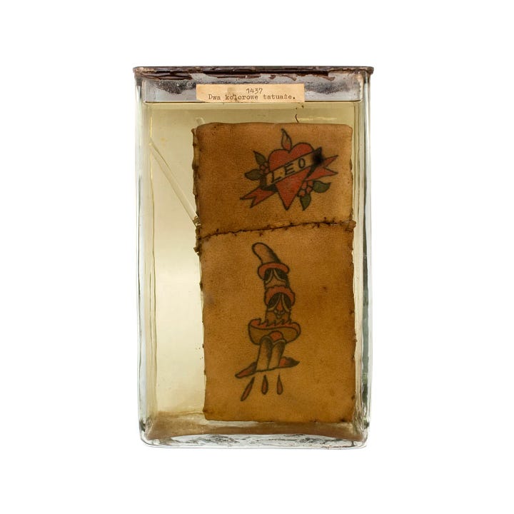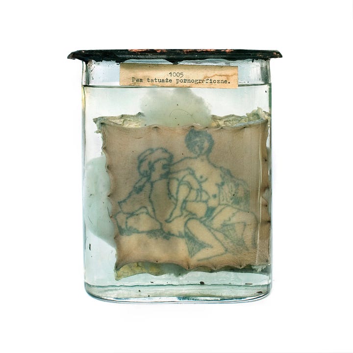 In the early 2000s, Polish photographer Katarzyna Mirczak documented a forensic archive found within a Kraków university that contained jars of tattooed skin collected from prisoners who died in custody.