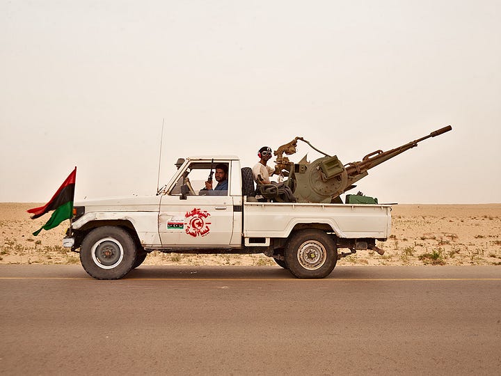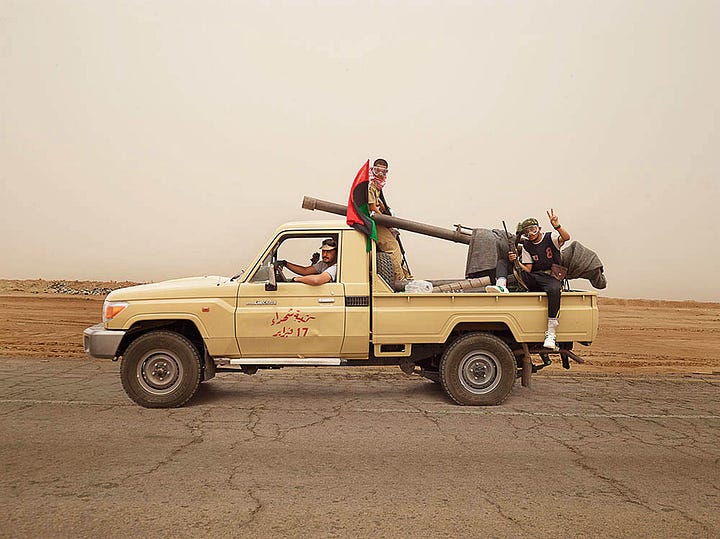 If the trucks appear dented and derelict, it’s because they were modified quickly for desert combat, often marked with brigade names, slogans and the new Libyan flag instead of standard military equipment.
