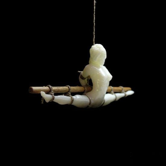The figures resemble small sculptural dolls or statuettes, shown with glossy pale surfaces, physical rope bindings, and occasional wooden elements.
