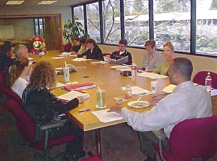Photo from the 2001 Nintendo Merchandising Inc. health and safety handbook, featuring Mario being crudely edited into a meeting of the safety committee to represent Nintendo's commitment to safety.