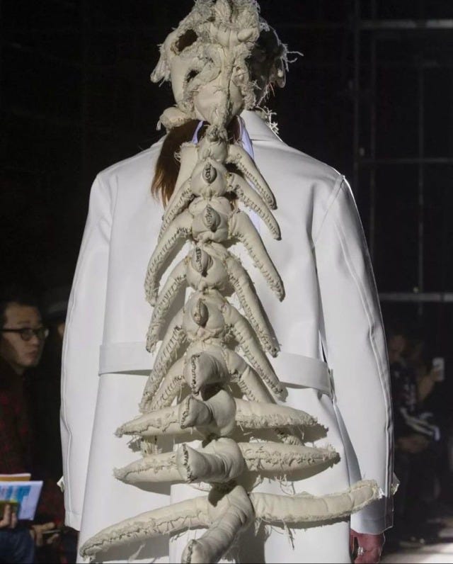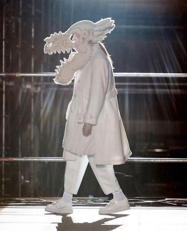 For Comme des Garcons Homme Plus Fall 2018, artist Shimoda Masakatsu designed a series of dinosaur inspired headpieces worn on the runway.