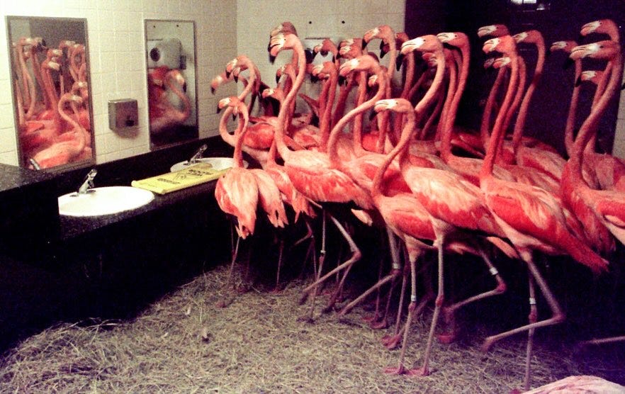 Flamingos in the bathroom of Miami Zoo during Hurricane Andrew in 1992.
